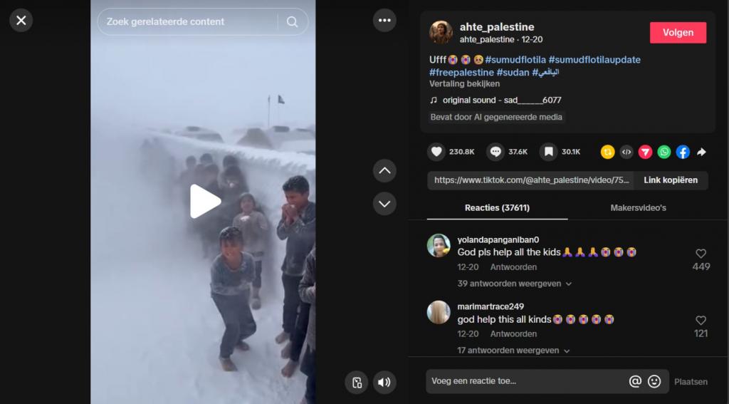 – Dat klopt. De beelden komen van een TikTok-account dat AI-beelden over Palestina maakt. Het sneeuwt niet in Gaza, maar er wordt wel geleden onder het winterse weer.