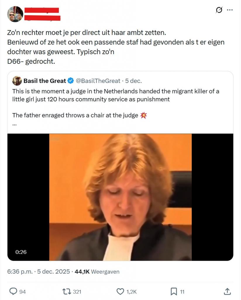 Op het einde van de video zien we hoe een man, de vader van het kind, een stoel gooit naar de rechter en dan door agenten ingetoomd wordt. ‘Benieuwd of ze het ook een passende straf gevonden had als het haar eigen dochter was geweest’, lezen we. De beelden werden ook door Elon Musk gedeeld en we vinden ze terug op zowel Facebook en X als op Instagram en LinkedIn.