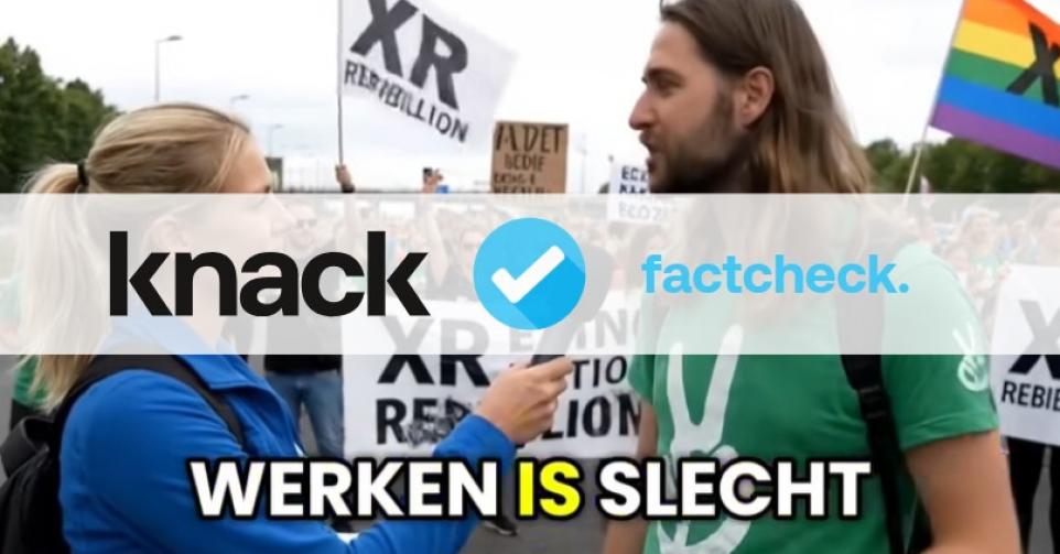 Online circuleert een filmpje waarin een demonstrant tijdens een interview zegt dat hij geen job heeft, omdat ‘werken slecht is voor het klimaat’. De video, die veel verontwaardigde reacties uitlokt, blijkt gemaakt met artificiële intelligentie.