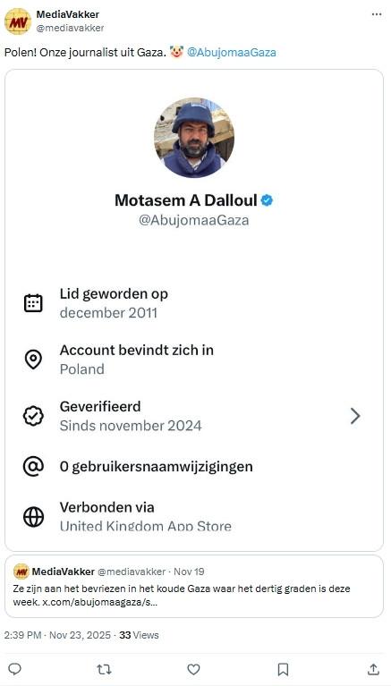 Op sociale media circuleren berichten dat verschillende Palestijnse journalisten zich niet in Gaza zouden bevinden, terwijl ze dat wel beweren. Die claim begon te circuleren nadat X op 22 november een functie lanceerde waarmee je kunt zien waar een X-gebruiker zich bevindt.
