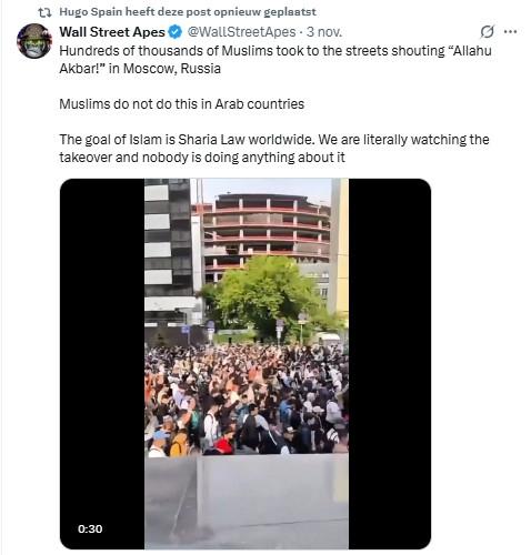 Op sociale media circuleert een video van een optocht van mensen. De menigte roept luidkeels de woorden ‘Allahu Akbar’ of ‘God is Groot’ in het Arabisch. Volgens de mensen gaat het om een optocht van moslims in de Russische hoofdstad Moskou.