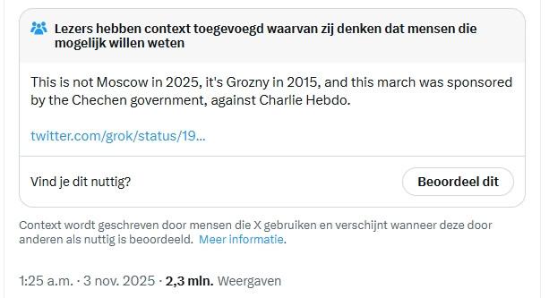 – Op sociale media circuleren beelden van een menigte. Volgens socialemediagebruikers gaat het om een optocht van moslims in Moskou. Volgens Grok, de AI-chatbot van X, zouden de beelden een betoging uit 2015 in Tsjetsjenië tonen.