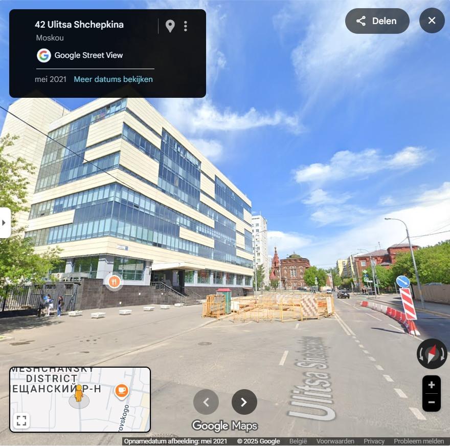 We zoeken op Google Maps in de buurt van de Kathedraal-Moskee van Moskou. Wanneer we met behulp van Google Streetview de straten in de buurt afwandelen, zien we plots de toren uit de virale beelden. Het blijkt de toren van een orthodoxe kerk te zijn.