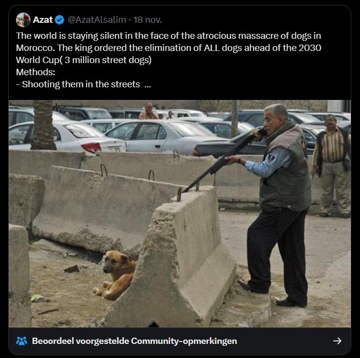Op sociale media circuleert een afbeelding van een man die een hond dood lijkt te schieten. Volgens de verspreiders van het beeld zou het incident zich in Marokko hebben voorgedaan. ‘De koning (van Marokko, nvdr.) heeft de eliminatie van alle honden bevolen in de aanloop naar de wereldbeker van 2030’, schrijft iemand bij het beeld op X.