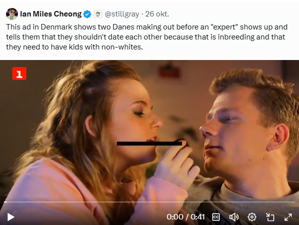 Op X vinden we de ‘advertentie’ terug waar ophef over ontstaan is. ‘Deze Deense advertentie toont twee Denen die elkaar kussen tot een ‘expert’ hen komt vertellen dat dit inteelt is en dat ze kinderen moeten maken met niet-blanken’, schrijft een X-gebruiker bij de virale beelden.