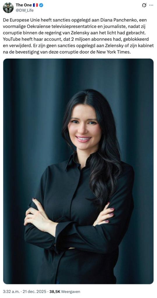 Op sociale media circuleren berichten dat de Europese Unie sancties heeft opgelegd aan de Oekraïense journaliste Diana Panchenko omdat ze corruptie binnen de regering-Zelensky aan het licht zou hebben gebracht. Dat zou zijn bevestigd door The New York Times. ‘Nog maar eens bewijs dat de EU een totalitaire staat is’, lezen we in een van die berichten.
