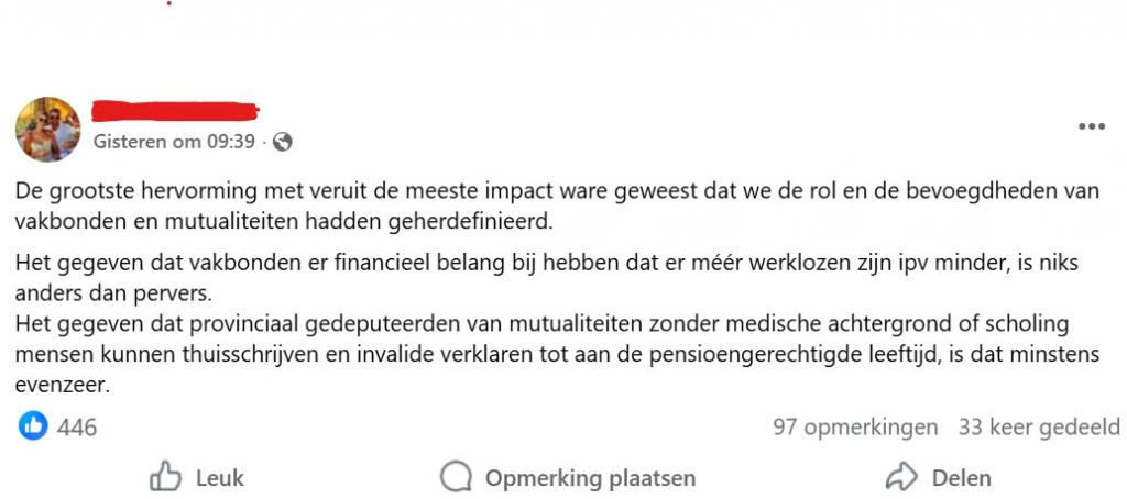 Op sociale media beweren verschillende gebruikers dat de vakbonden er financieel belang bij hebben dat er meer werklozen zouden zijn. ‘Het gegeven dat vakbonden er financieel belang bij hebben dat er méér werklozen zijn in plaats van minder, is pervers’, lezen we op Facebook.