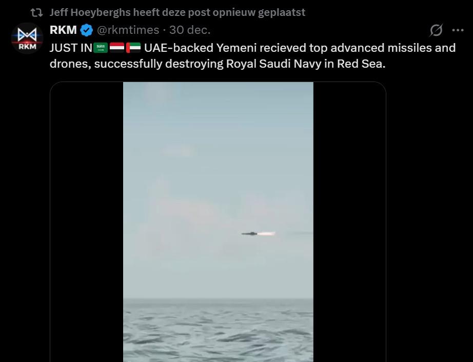 ‘De door de Verenigde Arabische Emiraten (VAE) gesteunde Jeminieten hebben geavanceerde raketten en drones gekregen. Daarmee vernietigen ze met succes een schip van het Koninklijk Saoedische leger in de Rode Zee’, schrijft iemand bijvoorbeeld op X. Deze post werd geretweet door de bekende plastisch chirurg Jeff Hoeyberghs.