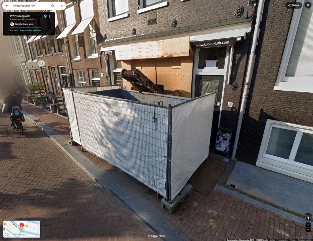 We controleren of die locatie correct is met Google Streetview. De meest recente beelden op Google Streetview dateren van 2019. Er zat toen duidelijk nog een andere zaak in het pand, maar we herkennen wel de deuren en ramen van de galerie die op de virale beelden staat.
