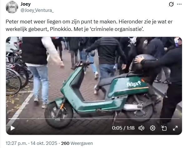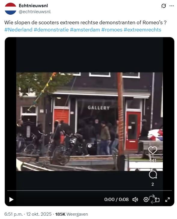 ‘Wie slopen de scooters? Extreemrechtse demonstranten of de Romeo’s?’ schrijft iemand bijvoorbeeld boven de beelden op X. Romeo is een term die in Nederland gebruikt wordt om politieagenten in burger aan te duiden die met protesten meewandelen om de orde te bewaren. Criticasters van die politieagenten beweren dat ze protesten net laten escaleren in plaats van ze binnen de perken te houden.