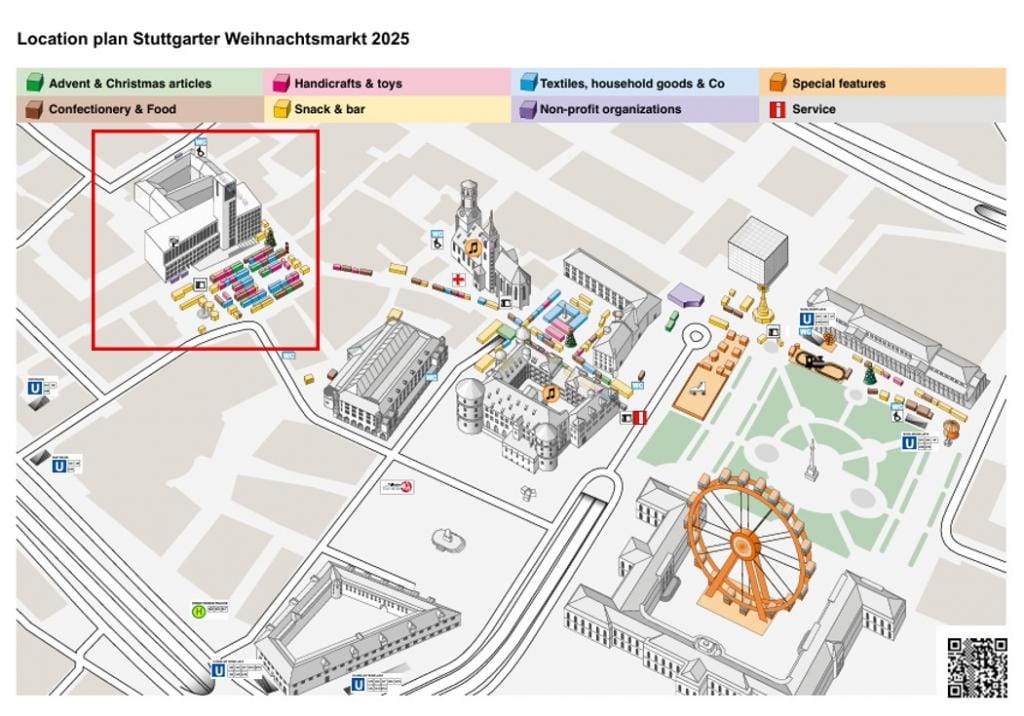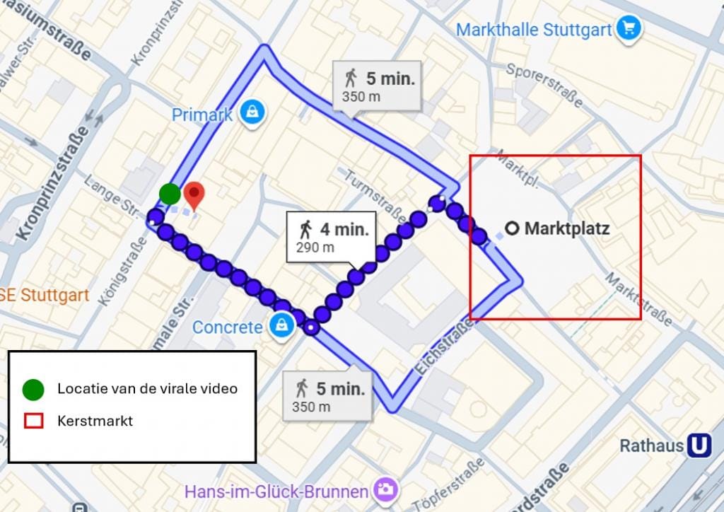 Op de website van de kerstmarkt van Stuttgart vinden we een plan terug, waarop alle locaties zijn afgebeeld. De meeste kraampjes staan verspreid in de buurt van de Schlossplatz en de Schillerplatz aan de rand van het centrum. De locatie met kerstkraampjes die het dichtst bij de Uniqlo ligt, is de Marktplatz. Dat plein ligt wel al op 290 meter wandelafstand van de plaats waar de virale beelden zijn opgenomen. In de Königstraße staan geen kerstkraampjes.