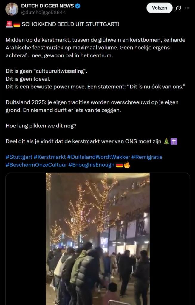 ‘Schokkend beeld uit Stuttgart!’, reageert iemand op X. ‘Midden op de kerstmarkt tussen de glühwein en kerstbomen, keiharde Arabische feestmuziek op maximaal volume.’