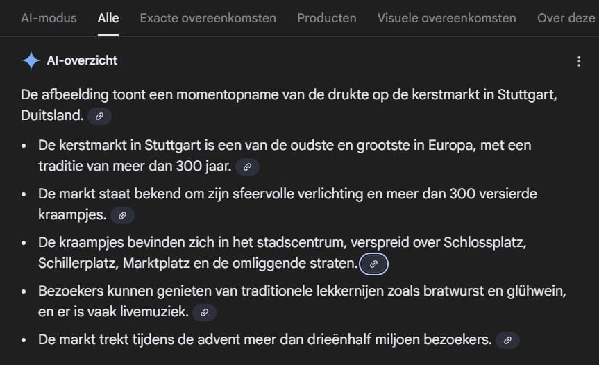 We geven een schermafbeelding van de video in op Google Lens. Google schotelt ons automatisch een door AI gegenereerde omschrijving van de afbeelding voor. ‘De afbeelding toont een momentopname van de drukte op een kerstmarkt in Stuttgart, Duitsland’, lezen we daar. Vervolgens schotelt Google ons een aantal feiten over die kerstmarkt voor, telkens met een link erbij.