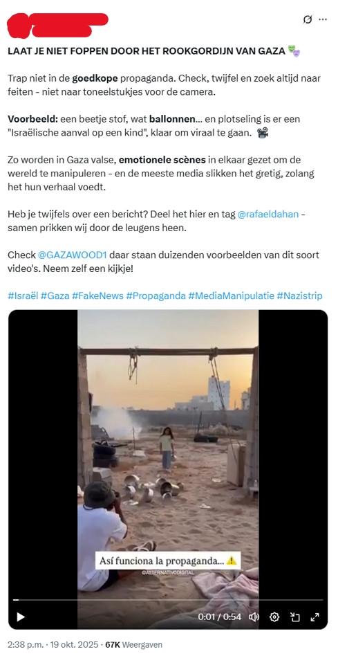 ‘Trap niet in de goedkope propaganda’, schrijft iemand bijvoorbeeld op X bij de beelden. ‘Check twijfel en zoek altijd naar feiten – niet naar toneelstukjes voor de camera.’ De auteur van die post verwijst naar het account @GAZAWOOD1. ‘Gazawood’ en ‘Pallywood’ zijn termen die pro-Israëlische accounts gebruiken om de beelden die uit Gaza komen in diskrediet te brengen.