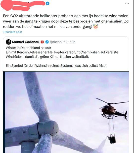 ‘Een CO2 uitstotende helikopter probeert een met ijs bedekte windmolen weer aan de gang te krijgen door deze te besproeien met chemicaliën. Zo redden we het klimaat en het milieu van ondergang!’ schrijft iemand op X.