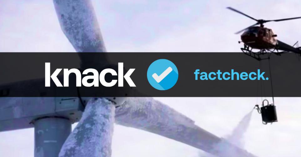 – Op sociale media circuleert een afbeelding van een windmolen die ontdooid wordt door een helikopter. Volgens de verspreiders van de beelden sproeit de helikopter chemicaliën op de wieken van de windmolen.