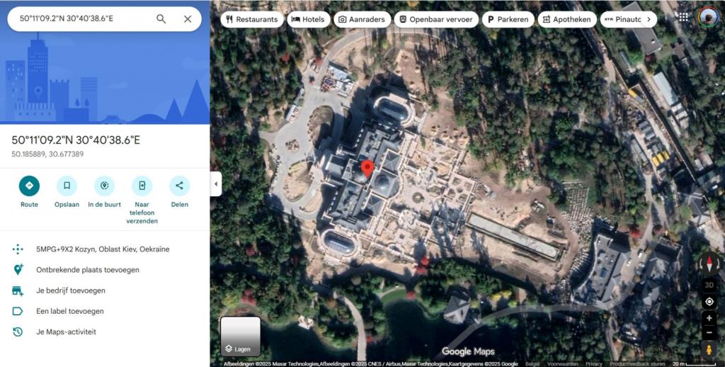 De satellietbeelden dateren van 2025, vijf jaar nadat de dronebeelden genomen werden. Zoals te zien is, is de woning nog steeds in aanbouw. Ze ligt zo’n veertig kilometer ten zuiden van Kiev.