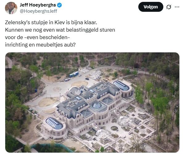 ‘Zelensky’s stulpje in Kiev is bijna klaar. Kunnen we nog even wat belastinggeld sturen voor de – even bescheiden – inrichting en meubeltjes alstublieft?’ schrijft plastisch chirurg Jeff Hoeyberghs bijvoorbeeld op X. ‘Is dit het optrekje van Zwendelensky in Kiev?’ schrijft iemand anders op datzelfde platform.