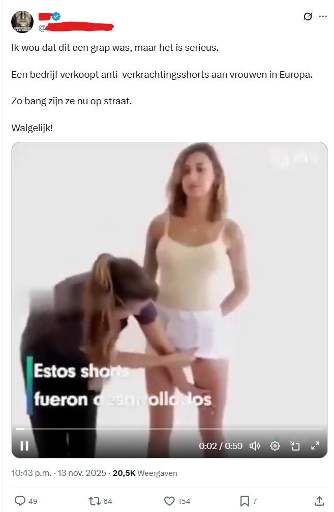 Op sociale media circuleert een video met Spaanse ondertiteling waarin ondergoed getoond zou worden dat je zou beschermen tegen verkrachting. Volgens socialemediagebruikers zou dat momenteel in Europa verkocht worden omdat er te weinig wordt opgetreden tegen aanranding en verkrachting. ‘Zo bang zijn vrouwen nu op straat. Walgelijk!’ lezen we.
