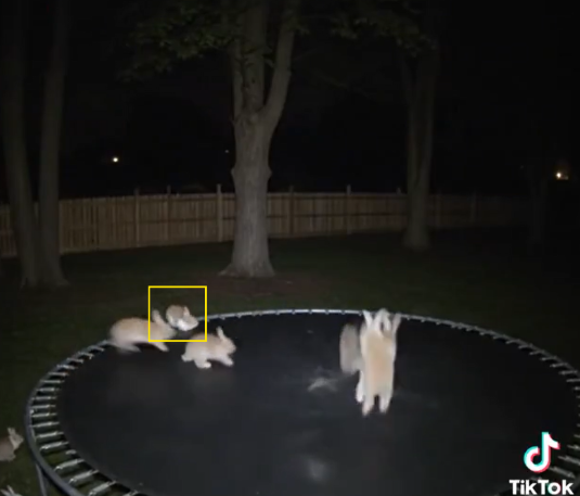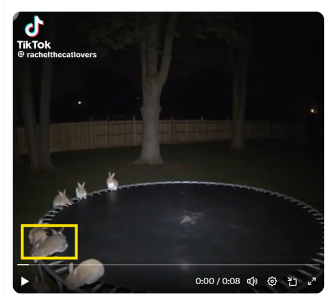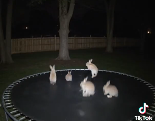 Online circuleert een video, die door een beveiligingscamera lijkt te zijn opgenomen, waarin een groep konijnen te zien is die op een trampoline aan het springen zijn.