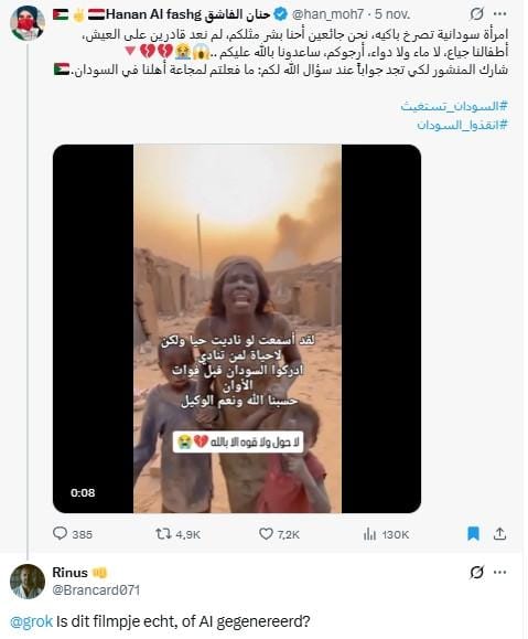 Maar niet iedereen is het daarmee eens. Op X vragen mensen zich af of de beelden wel echt zijn. ‘Is dit filmpje echt of door AI gegenereerd?’ vraagt een Nederlandstalige X-gebruiker bijvoorbeeld aan Grok, de AI-chatbot van X. Grok denkt dat het filmpje AI-gegenereerd is.