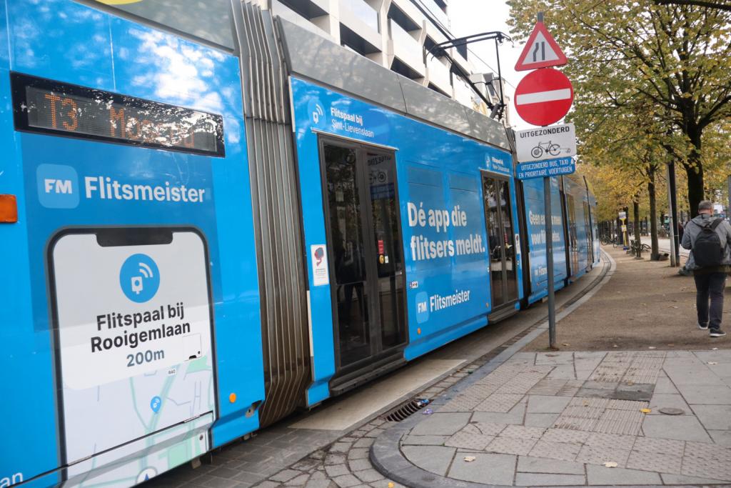 Integendeel zelfs, ze doen er nu nog een schep bovenop. Sinds kort rijdt er in Gent een tram rond waarvan de ruiten zijn beplakt met reclame voor Flitsmeister, een app die waarschuwt voor flitspalen en snelheidscontroles.