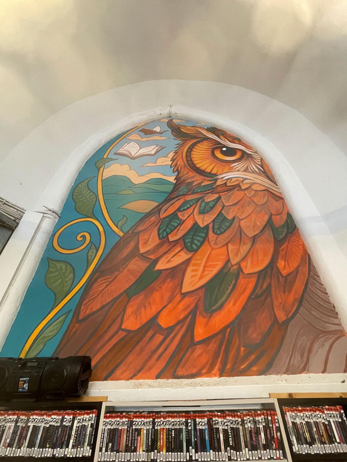 “En wat vind je ervan?” vraag ik, omhoog wijzend naar de muurschildering. “Ja, het is echt prachtig, nog beter dan ik had verwacht,” antwoordt de gedetineerde, een begenadigd en fervent tekenaar die heeft meegeholpen aan het ontwerp—een rood-groene uilenkop die je met priemende ogen aankijkt, tegen de achtergrond van een wijds vista waarin boeken wegvliegen als vogels.