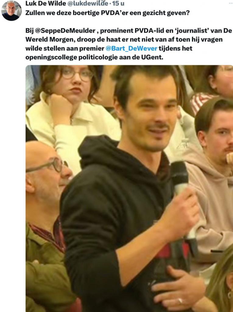 Premier Bart De Wever (N-VA) was vorige week doelwit van een verijdelde aanslag. De N-VA roept op om het debat proper te houden, want woorden wekken agressie op. Behalve als het gaat om Seppe De Meulder, een linkse jongeman die het aandurfde om eerder die week een kritische vraag te stellen aan de eerste minister.