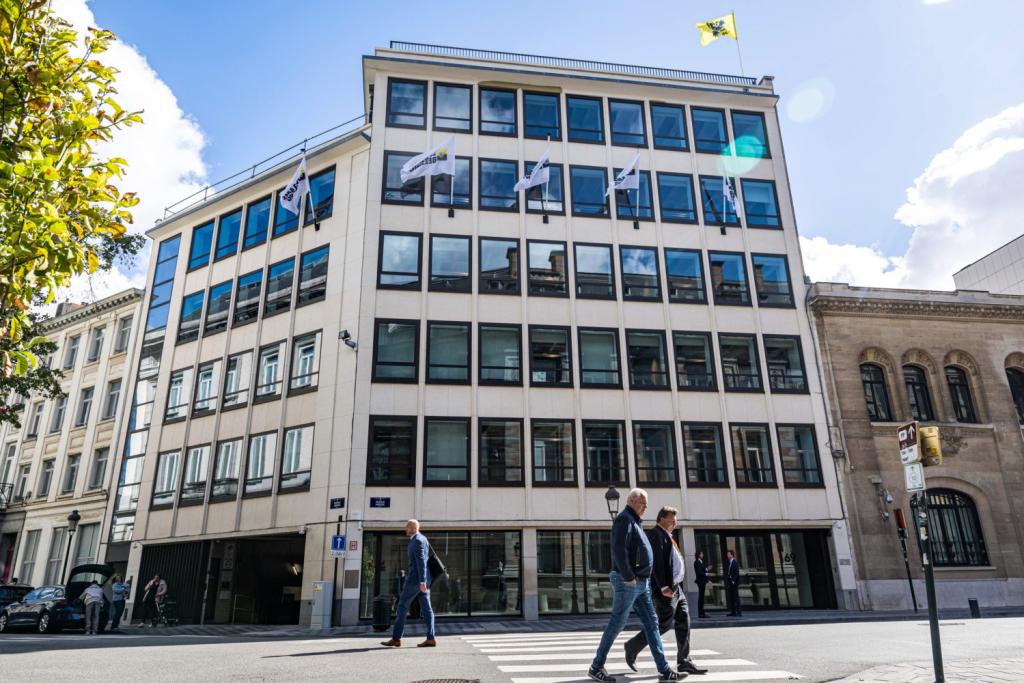Vanaf het dakterras, met een wapperende Vlaamse Leeuw achter zich, wijst Tom Van Grieken een groepje journalisten de verschillende Brusselse herkenningspunten aan. Rechts ligt het bureau van Freya Van den Bossche (Vooruit), voorzitter van het Vlaams Parlement. Aan de overkant bevinden zich de kantoren van het federaal parlement. En links ligt de Wetstraat 16, uitvalsbasis van premier Bart De Wever (N-VA).