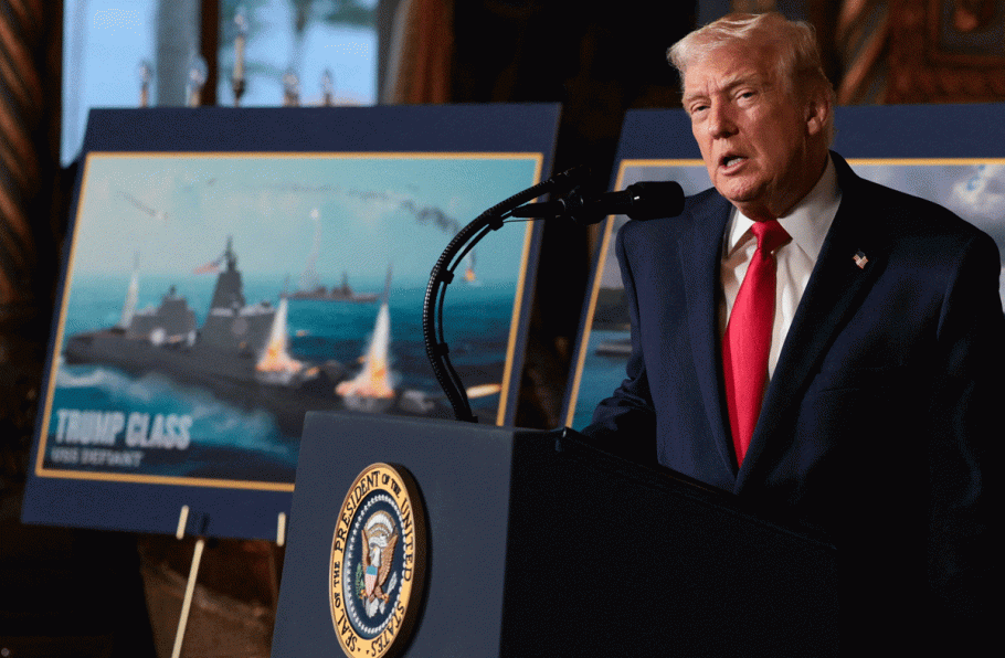 De persconferentie van Trump was eigenlijk bedoeld om een nieuwe klasse van grote slagschepen aan te kondigen, die zijn naam zal dragen. Het is ongebruikelijk dat een zittende president zijn naam geeft aan oorlogstuig. Hij noemde wat er op komst is ‘een gouden vloot’.