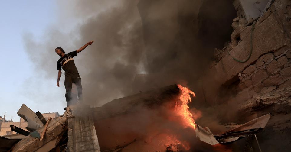 Een Palestijnse man staat op de resten van een gebouw dat in elkaar gestort is na een Israëlische aanval op Khan Yunis in het zuiden van de Gazastrook op 4 november 2023. © Mahmud HAMS / AFP
