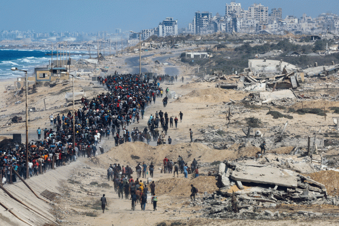 Verdreven Palestijnen keren via verwoeste wegen terug naar het noorden van Gaza na het staakt-het-vuren tussen Israël en Hamas © Reuters