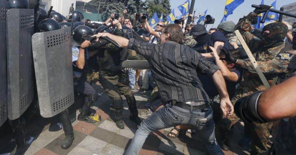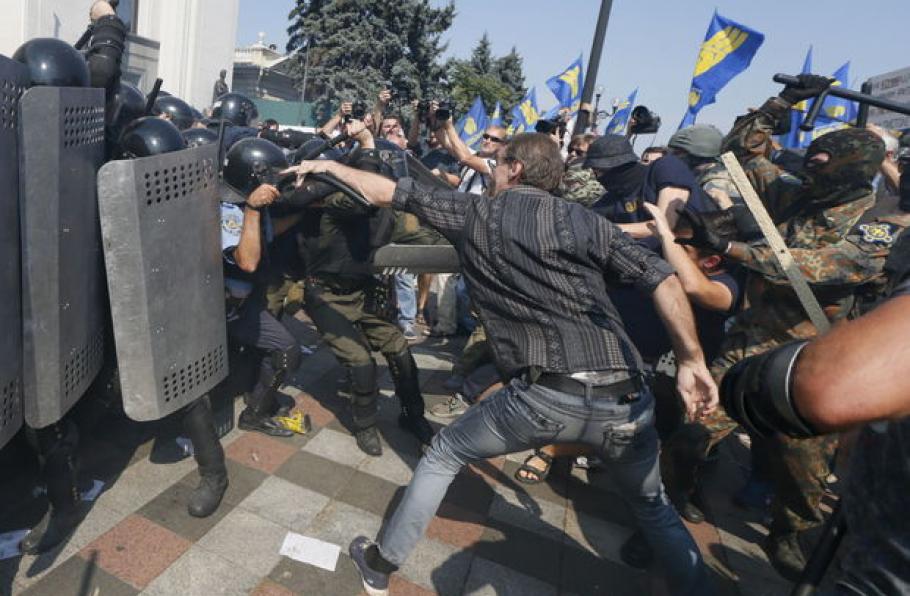 Enkele honderden militanten van de nationalistische partij Svoboda verzamelden zich al in de ochtend om tegen de hervorming te protesteren. De extreemrechtse beweging Pravy Sektor verklaarde het verkeer in de straat voor het parlement te hebben geblokkeerd. Avakov beschuldigde eerder al Svoboda-militanten ervan “verschillende springtuigen” naar de ordediensten te hebben gegooid. (Belga/NSK)