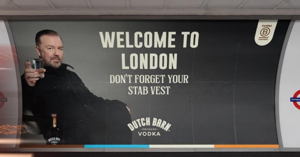 ‘Welkom in Londen. Vergeet je steekvest niet.’ Die tekst valt te lezen op een advertentie voor het vodkamerk Dutch Barn dat de voorbije jaren gepromoot wordt door de Britse acteur, scenarist en stand-upcomedian Ricky Gervais. We zien Gervais poseren met een glas op een levensgrote affiche tegen de wand van een Londens metrostation, te herkennen aan het logo rechts in beeld.