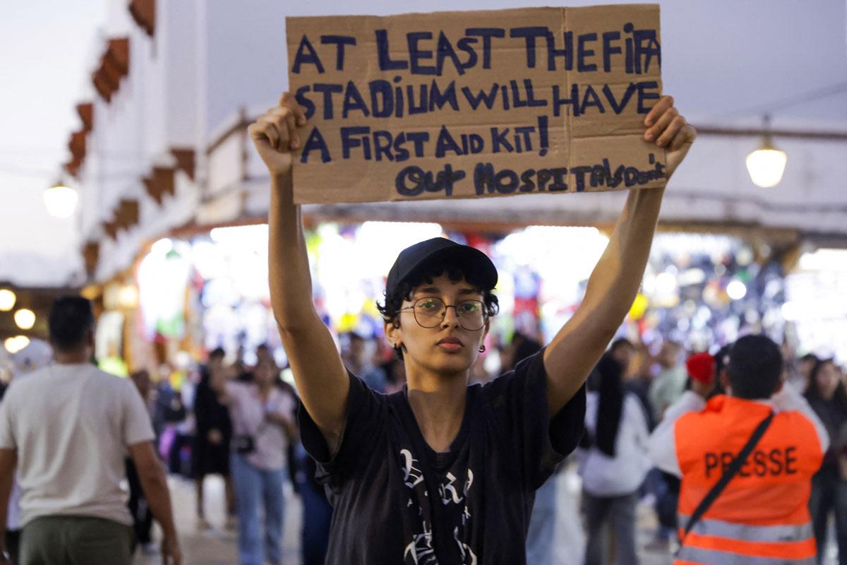 Demonstranten zijn verontwaardigd over de miljardeninvesteringen in het WK van 2030 en de Africa Cup dit najaar – voor voetbal is er wel geld. ‘Stadions bouwen, allerlei investeringen en grote evenementen organiseren’, bevestigt Souhail. ‘Maar ondertussen sterven mensen omdat ziekenhuizen niet over basisvoorzieningen beschikken.’