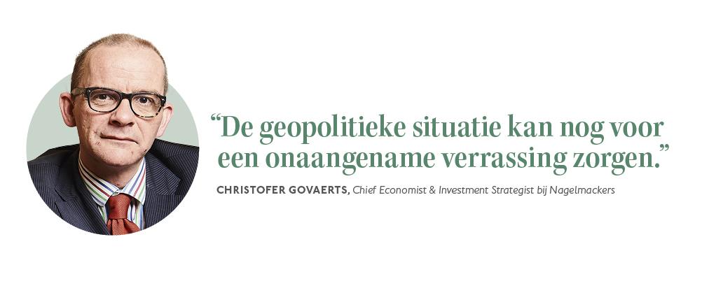 Er is de aanhoudende oorlog in Oekraïne, en de problemen in het Midden-Oosten. Tot nog toe hebben deze conflicten nog geen al te grote impact gehad op de financiële markten. Er was uiteraard wel de inflatoire impact en de olieprijzen zijn ook wel wat gestegen. Maar dat bleef al bij al beperkt. Alleen blijft de situatie in Oekraïne duren, en breidt het conflict in het Midden-Oosten zich uit. We spelen daar echt met vuur en als we niet opletten kan de vlam echt in de pan slaan. Met sterk stijgende olieprijzen of een terreurdreiging kan het marktsentiment snel omslaan, wat een impact kan hebben op de aandelenmarkt die dan een eerder afwachtende houding kan aannemen. De geopolitieke situatie kan nog voor een onaangename verrassing zorgen.”