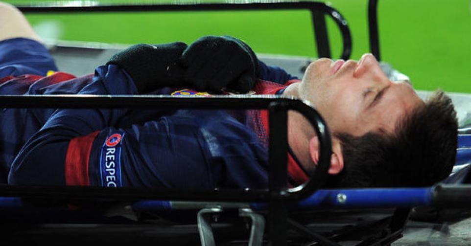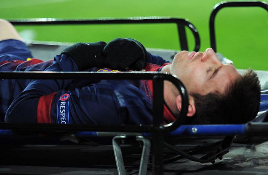 Messi viel tegen Benfica in na 58 minuten. Toen hij in de 85e minuut Benfica-doelman Artur wilde omspelen, raakte hij geblesseerd en moest op een draagberrie het veld verlaten. Hij liep een kneuzing aan de linkerknie op.